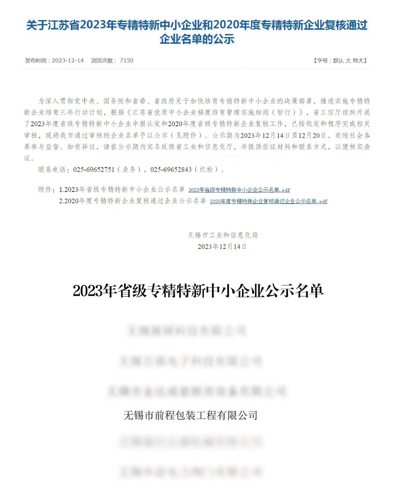 近日,無錫市工業(yè)和信息化局發(fā)布了《關于江蘇省2023年專精特新中小企業(yè)和2020年度專精特新企業(yè)復核通過企業(yè)名單的公示》,前程公司從眾多申報的企業(yè)中脫穎而出,被認定為江蘇省“專精特新”企業(yè)。